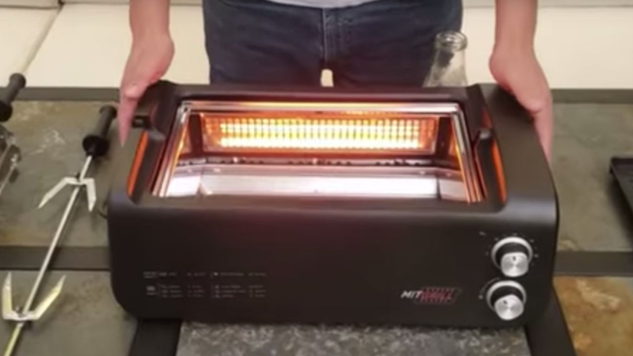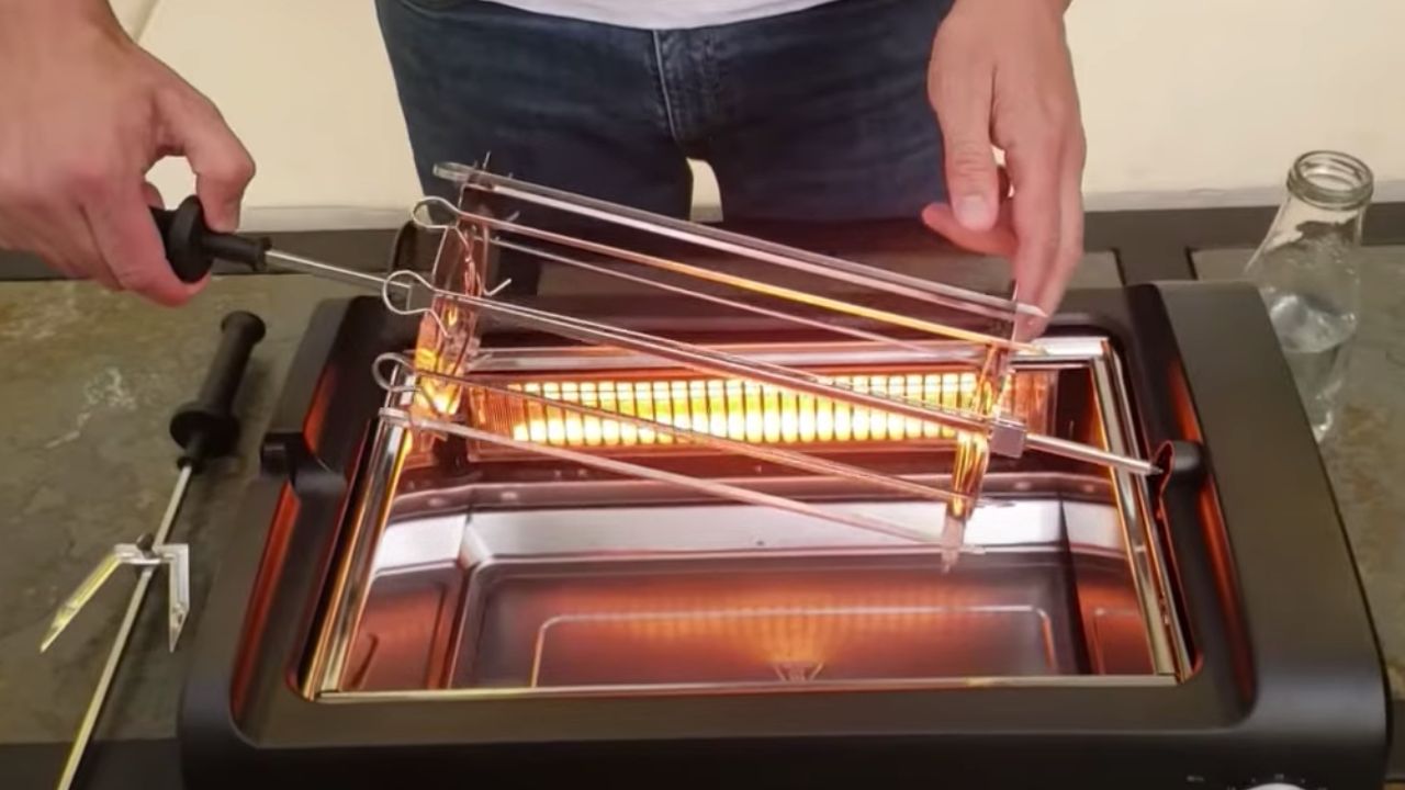 Paso 3: Si vas a usar el spiedo, puedes saltarte el paso 2 y sólo retirar la rejilla antiadherente y, en su lugar, ajustar el spiedo insertando los extremos en los espacios correspondientes. Luego encender el botón del spiedo en uno de los costados de la parrilla para que comience a girar.